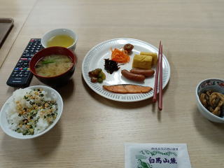 明日は平日なのでそこまで混んでなくて、ウェアを干すところもハンガーも使い放題。持ってきたお惣菜で夕食。天気と岩岳の様子を確認。