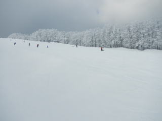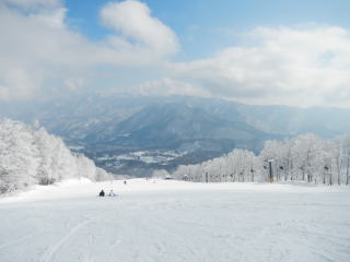 車の上には、しっかり積もっていた。車の中で山荘からの荷物の片付けと温泉を調べているうちに、少し天気が良くなってゲレンデ全体が見えるようになってきた。