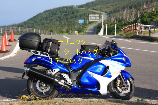 私のハヤブサには、前からタンクバッグ、シートにディバッグ、シートバッグ、リュック、そしてキャリアにトップケースがのっている。