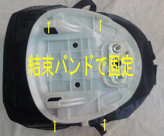 リアシートのシート部分(スポンジや表皮)をのけてベースだけにしてから、ディバッグを結束バンドで固定している。