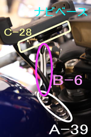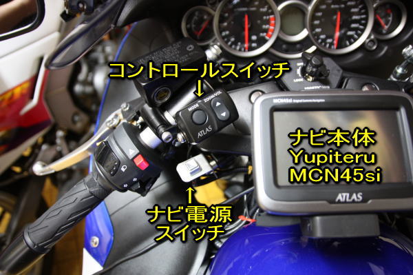 ナビ電源ステーはバイク屋さんの自作。ナビ電源スイッチをつけると走行中でもナビの操作ができる。(危ないのでほとんどしないけど)