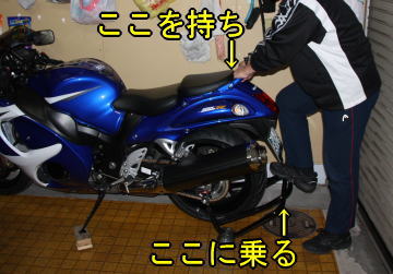私は真後ろから,アシストグリップを持ってスタンドを足でふみ後輪を上げます。