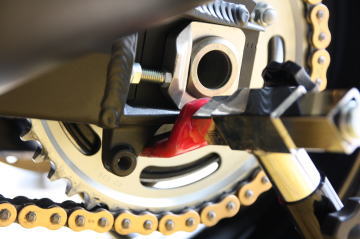 左スイングアーム(リアシャフト近く)にL受けを当てて
