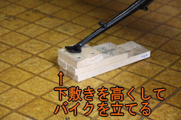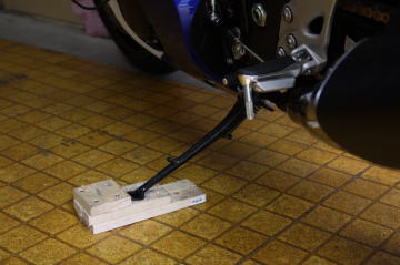 アップ用に自作のサイドスタンドの下敷きを作っている。これでバイクを垂直近くまでにしていると,アップ時の安定性が上がります。