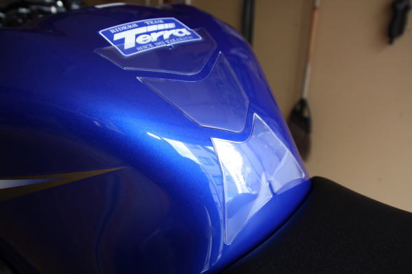 ちょっと走ってみたらタンクのところに細かな傷が… 前傾だし,私はお腹が出ているからジャンパーのチャックが当たるようだ。 terraのステッカーを貼ってみたが,とてもカバーしきれるものではないのでタンクパットを貼った。 ノーマルが大好きな私は,タンクパットも派手なのがイヤなので透明のにしてみた。 いい感じなのだが,空気が入っているのがよく分かる。青にすれば良かったかな。