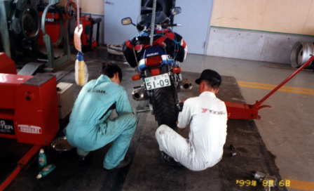 と,聞いてくる。あれこの人,バイクも扱っているのかなと思っていると,鮮やかに,後輪を浮かせ,タイヤをはずす。その後も実に手際よく修理していく。私がいつも言っているオートバイタイヤ専門店でもこんなに手際がよかったかなと思うくらいである。