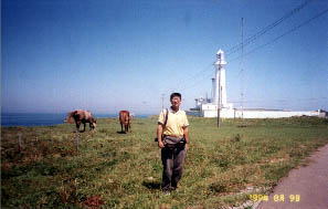 ここも前回,ルートの関係で(この付近も未舗装路が多かった)断念したポイント。岬一帯が牧場ということで,岬に向かう道にはゲート(馬が外に出ないように)があり,オートバイの場合はそこにあるボタンを押してゲートを開け,尻屋崎に向かう。岬付近には馬が多く放牧されており,広い土地にあこがれている私として感動ものでした。