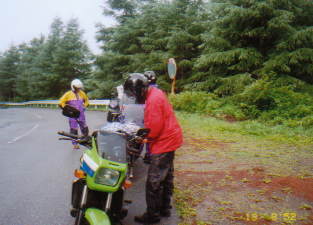 やっと待避所のような所を見つけ,停車。みんなカッパを着る。すでに肩や腕などがじっとりと濡れている。