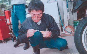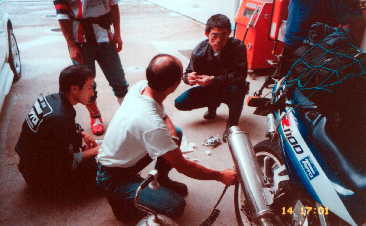 でも,この前タイヤを交換したばかりやし,中までは,いっとらんはず。と信じてそっと釘を抜きにかかる。長い。長いではないか。まずい。と思いながら抜くと同時にシューというエアの音。とっさに抜いたくぎをさし,メンバーに相談する。10日間の間に2回もパンクしたやつを俺は見たことがない。(こうざいさん談)そう私は,この夏のソロツーリング(東北ツーリングでのパンクレポートへ)でもパンクをしていたのだった。こんなことなら東京でタイヤを変えんでもよかったのに。(後悔先に立たず。)